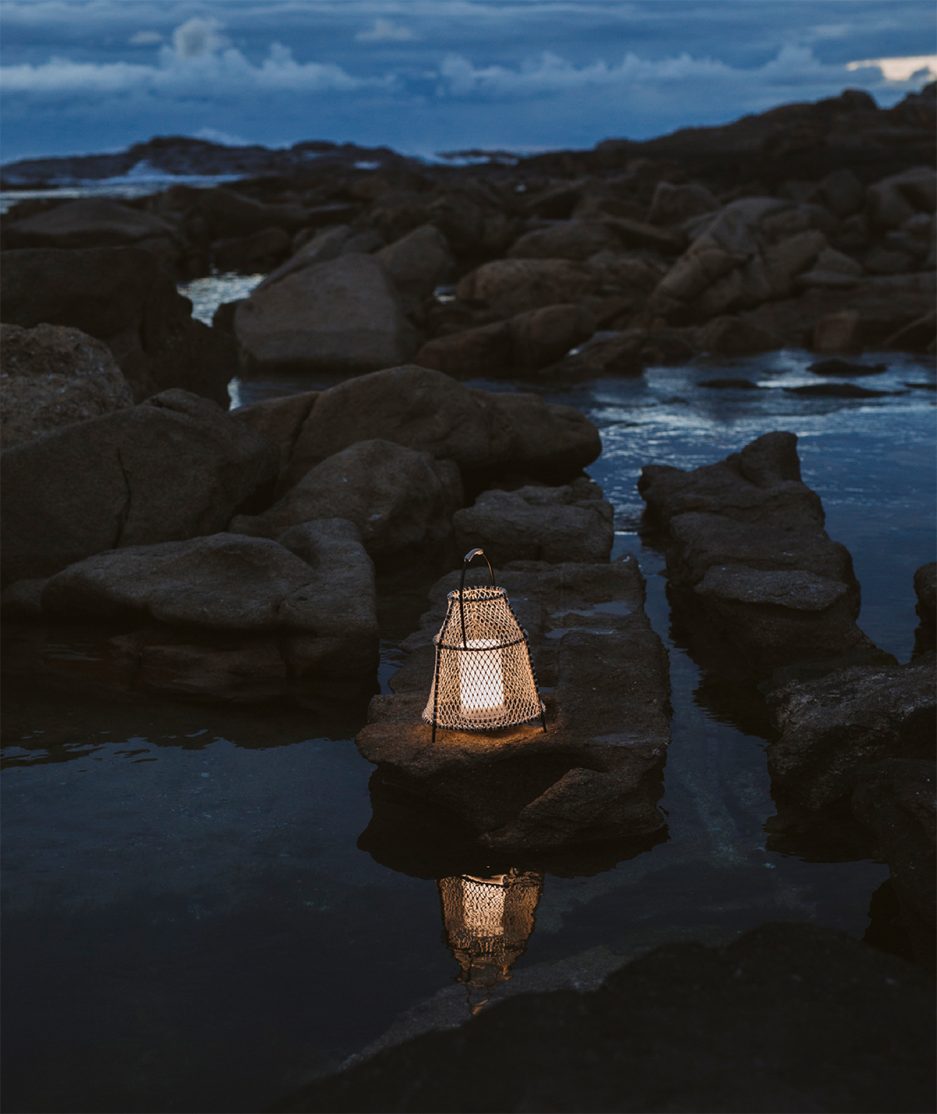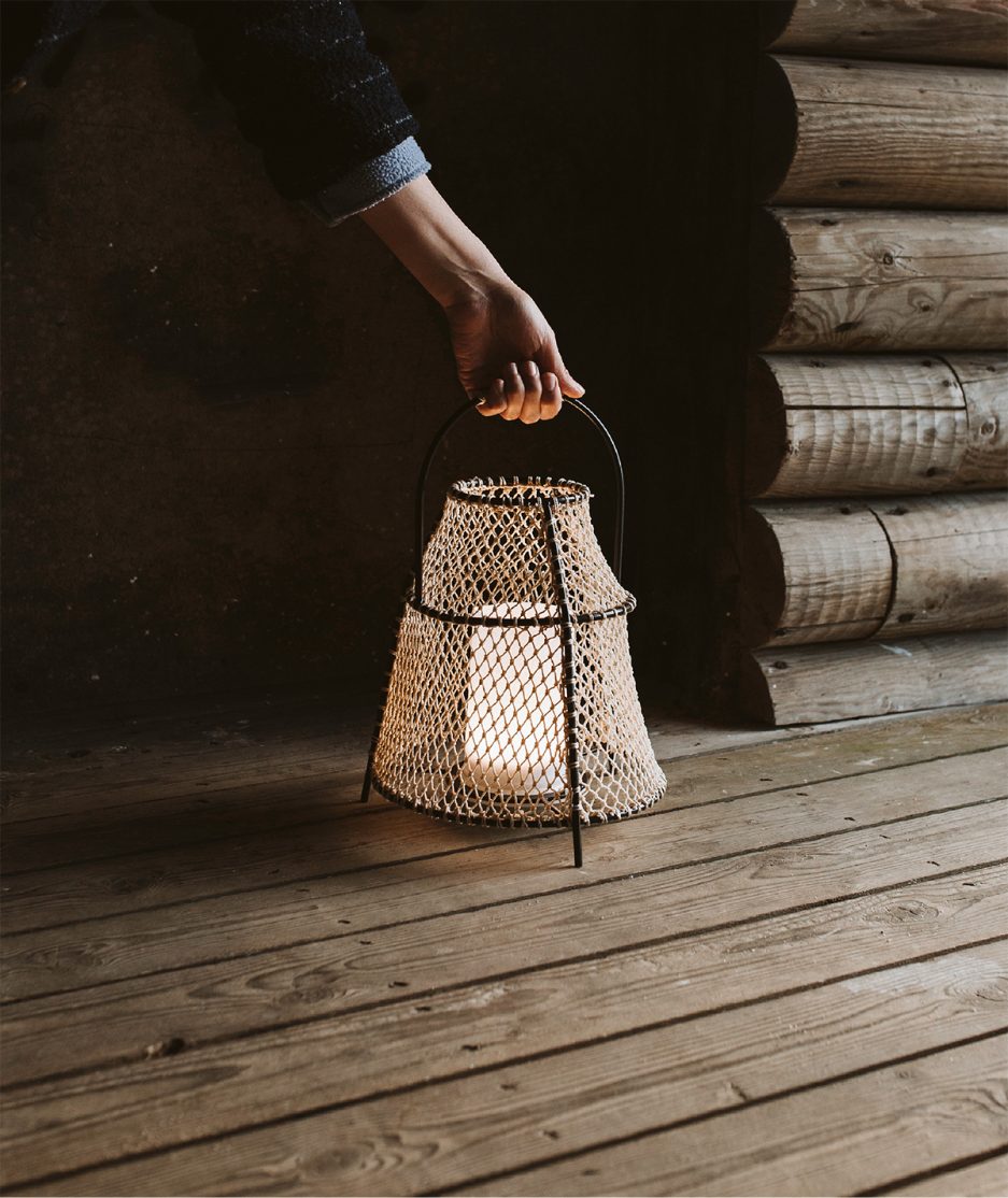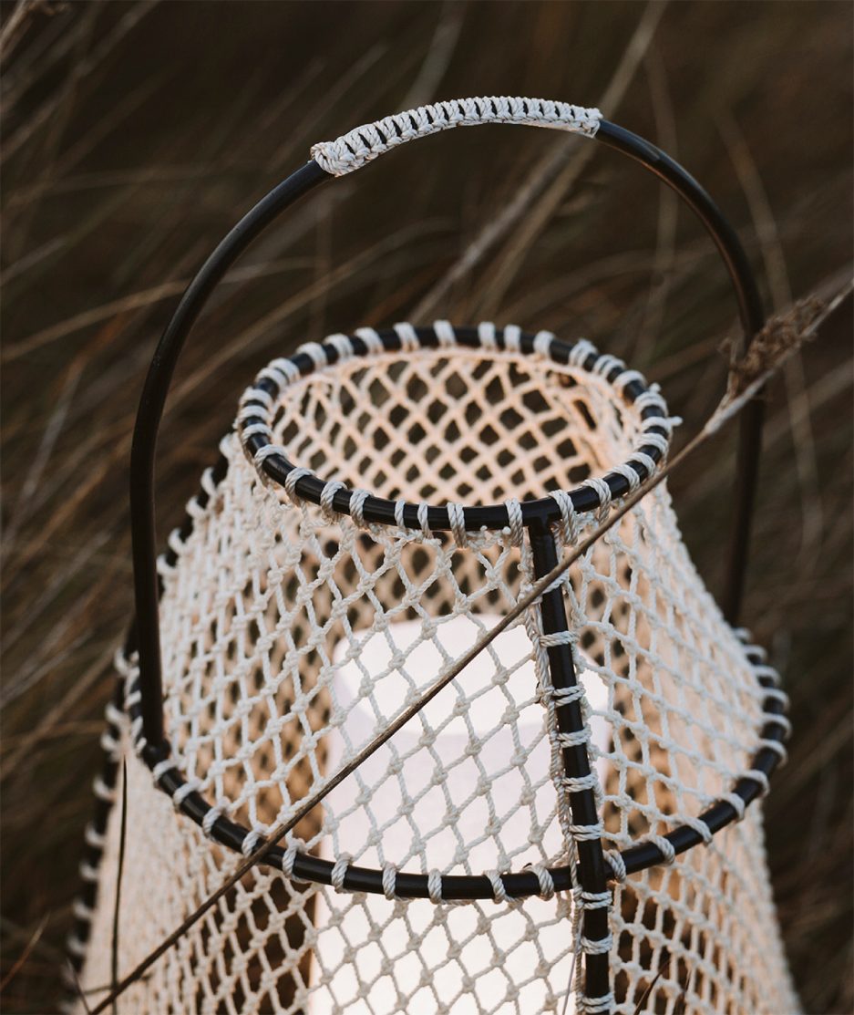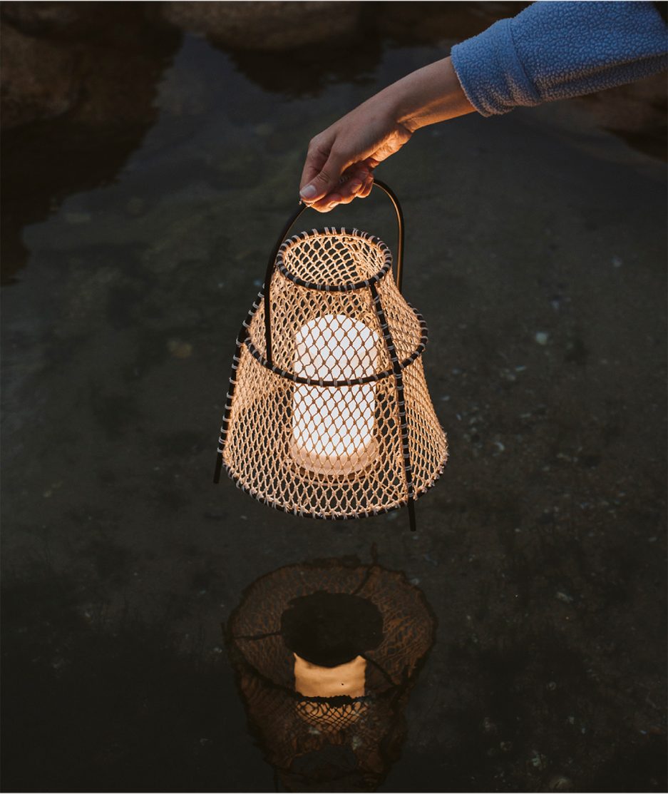 Saia is a table lamp combining metal structure with handwoven recycled fishing net. It represents the traditional baskets used for collecting “argazo” (seaweed). Handwoven by the redeiras of A Guarda using fishing nets recovered from the sea, it presents an innovative vision of nets, capturing the magic and individuality of handmade pieces.